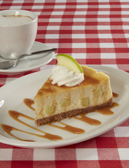 Rich Caramel and Diced Green Apple Cheesecake with a Cinnamon Sugar Cookie Crust Served with Whipped Cream and a Caramel Swirl.