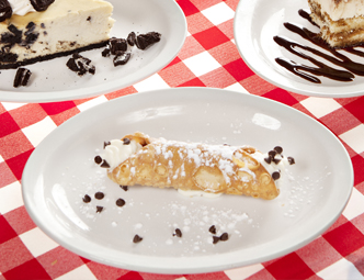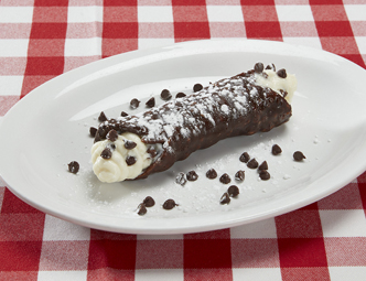 Crispy, rolled, fried pastry shell dipped in chocolate and filled with sweet ricotta cheese and chocolate chips, finished with powdered sugar and more chocolate chips.