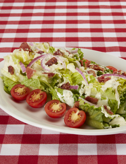 Romaine Lettuce, Bleu Cheese Dressing, Bacon, Red Onions, Gorgonzola Crumbles and Cherry Tomatoes.