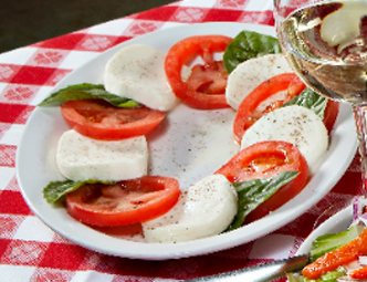 Slices Of Fresh Mozzarella, Tomatoes And Fresh Basil, Drizzled With Extra Virgin Olive Oil.