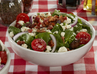 Baby Spinach, Red Onion, Cherry Tomatoes, Bacon, Crumbled Gorgonzola Cheese And Balsamic Vinaigrette Dressing.